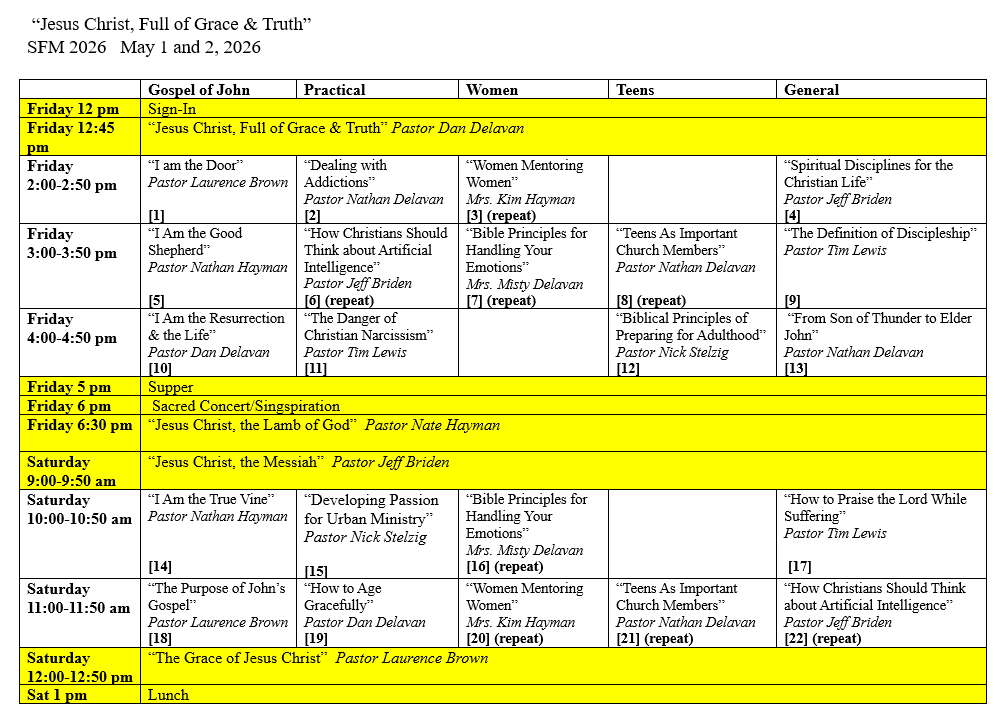 The only thing missing is you! We would love to have you join us to enjoy rich fellowship and high-quality teaching. Once again this year, there is no registration fee: attending the conference will only cost you the gas money to get here and a hotel stay. We do, however, require you to register so that we know how much food to prepare and which classrooms to assign for the elective sessions. Please register by April 20th so we can ensure we are prepared for your time with us. Also, if your child(ren) are coming with you, please make sure they are registered for electives to help with seating and food preparation. Please note that we are unable to provide childcare.
